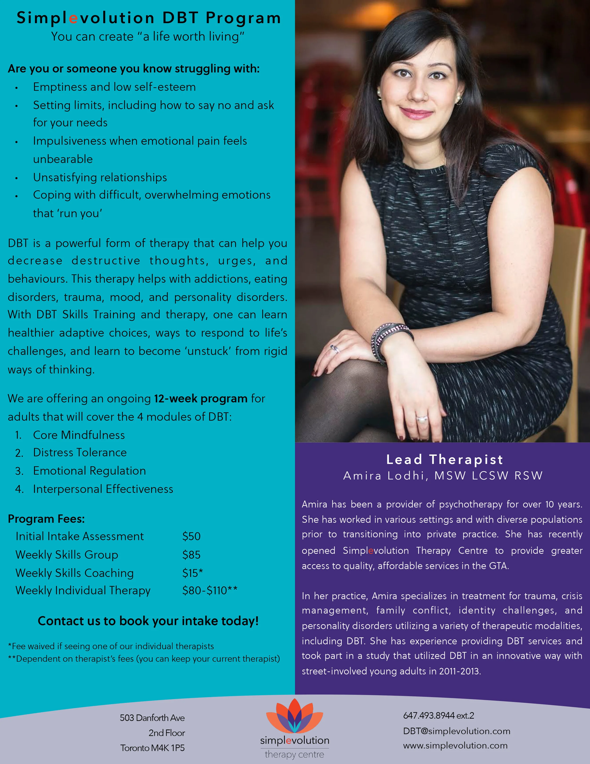 The Dialectical Behavioural Therapy (DBT) Skills Group is based on Marsha M. Linehan’s evidence-based skills training manual: Skills Training for Treating Borderline Personality Disorder. This is a companion to the Cognitive-Behavioural Treatment Manual with the same name. Together they complete the DBT Program that also includes DBT Individual Treatment.